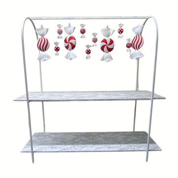 White Frame Alejandro Bar with Faux White Marble Shelves and Suspended Oversized Holiday Candies.
